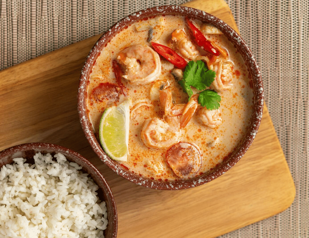 Тайский сладко-острый суп с морепродуктами и рисом, подаётся с тостом