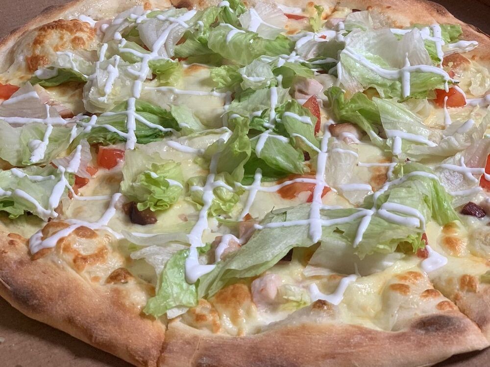 Тесто, соус Цезарь, куриное филе, салат Айсберг, сыр пармезан